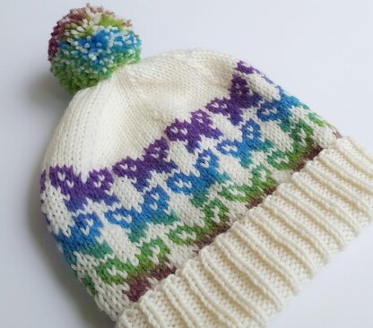 Did you know that a group of butterflies is called a kaleidoscope? This comfy hat pattern hosts a large kaleidoscope of butterflies that you can knit in whatever colors you choose. With a solid main color and your favorite color shifting yarn you can get beautiful results. Add some bright and cheery colors to your new winter hat or let nature inspire you with the colors of your favorite butterflies. This pattern really lends itself to getting creative with color.