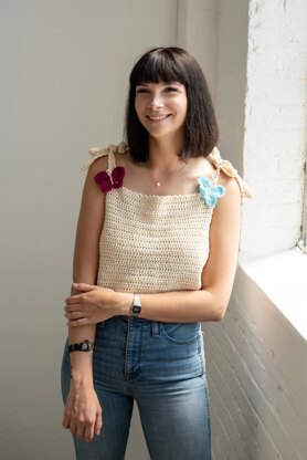 The Butterfly Tank Top is a crochet top pattern made with medium weight yarn that has a skill level of easy.