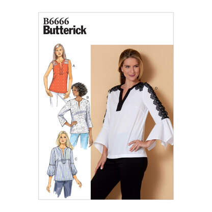 Haut ample à enfiler avec bande de cou insérée avec fente devant et variations de manches, de garnitures et de tissus. A : Biais acheté pour les emmanchures, garniture en dentelle. B : Superposition de dentelle contrastante. C : Manches élastiques, garniture achetée. D : Bande de cou contrastante, garniture achetée.