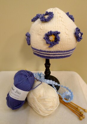 This gorgeous little cap with its sprinkling of blue and yellow daisies would go well with many outfits. In blue and white it would go very well with a sailor outfit if you left the daisies off and would be suitable for either a girl or a boy. It is a simple but neat fit and and the garter stitch border makes it stand out from an ordinary beanie. Little heads always need keeping warm so knit a few for yourself and some for your friends or the local hospital.