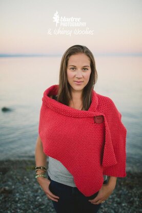 A take off of the ever popular three button shawl. The combination of stitch and yarn create the perfect drape for the perfect wrap. This two button version, allows for four different looks in one great shawl!