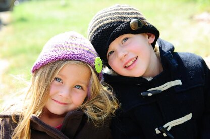 This is the perfect first hat project—easy as pie and cute as a button for both boys and girls. The brim is worked in garter stitch, and then the body of the hat is finished in a stripe pattern. The hat is accented with a button that is sewn through both layers of the hat. The beanie is also rather adorable without a button.