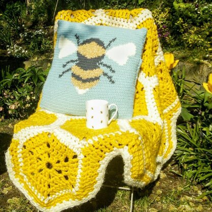 This buzzy bee crochet cushion cover pattern fits an 18 inch square pillow insert.