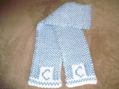 This is a slipped stitches pattern utilizing one yarn at a time. It includes written instructions and two charts for the monogrammed letter. It creates a double-knit scarf. The monogrammed "C" is the same on the front and back of the scarf.