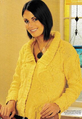 This is a pattern for a Cable and Bobble Cardigan, originally published in Knit Today. It has a cable with bobbles on the back, front and sleeves, rib edges and collar. The yarn has been discontinued, any yarn knitting to the tension can be used. Photos Knit Today.