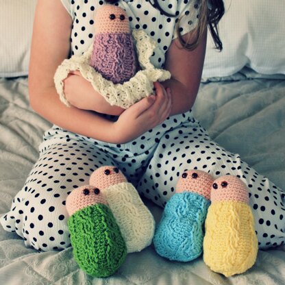 These sweet little crochet babies work up quickly and are the perfect size for little hands to hold. Design features a crocheted cable body. Make in several colors to create twins, triplets, or a whole nursery!