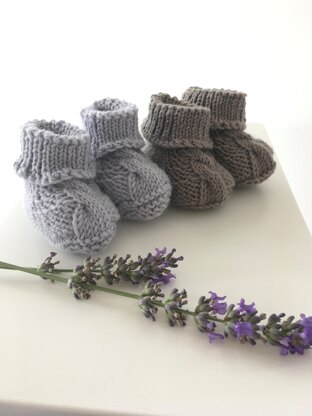 These neat little booties feature a cable pattern on the instep, thick garter stitch soles, and a folded ankle cuff for added warmth and to keep them securely on little feet.