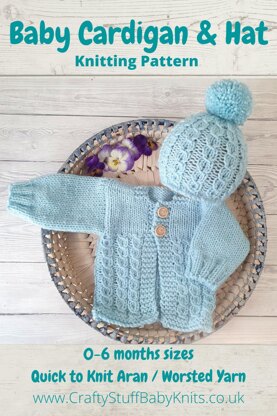 Adorable Baby Cardigan and Hat set for your to knit yourself. Knit your new baby an adorable cardigan with faux cable detail on the lower part, with a matching beanie hat. You can add a pom pom, or keep it simple. The jumper is knit in one piece from the bottom up, then split into the shoulder pieces. The little hat has the same all-over faux cabled pattern. (The cables are easy to make, and consists of four rows repeated - no cable needle required! ) The outfit is knit FLAT, not in the round. The baby outfit is knit in Aran / Worsted yarn, so that it knits up quite quickly.