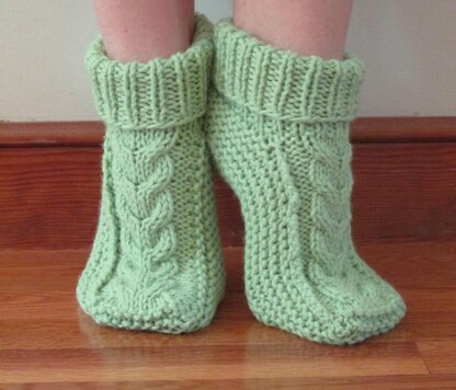 Using Berroco Vintage Chunky, these slippers are knit flat from the top down. After the cuff, you will work the top of the slipper with a cable pattern then pick up stitches to work the slipper sides and sole. They cuff is folded over and the cable pattern gives the slipper a lovely detail - these are so cozy and soft you won't want to take them off!