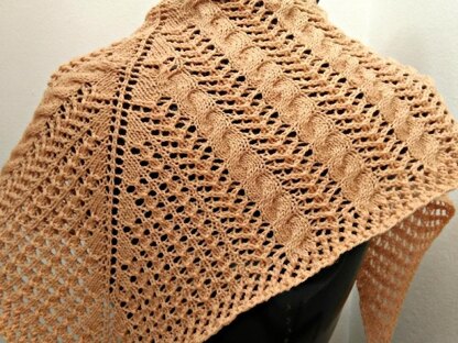 This is the first time I've designed a shawl using cables and wanted to combine this traditional element with lace stitches. You'll find 5 cable columns surrounded by an openwork pattern of lace stitches - on each half of the shawlette.