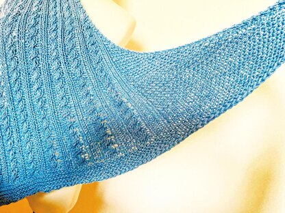 Cabletide Shawl is a richly textured and elegantly draped asymmetrical triangle shawl that grows from a point into wide wings. A sequence of sculptural cables and garter ridges creates a flowing, wave-like fabric that evokes the rhythm of tides. This shawl is perfect for layering and adds texture and warmth to any outfit.