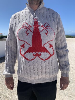 I love lighthouses and thinking about the fact that they are the beacon that leads us home. Portugal has many faróis, as they are called here, in beautiful locations. My “home” lighthouse is at Cabo Espichel – a bright structure in the midst of a wild and romantic landscape. The tower itself is nothing special, I am more interested in the symbol on the gate: two anchors, framing a lighthouse. This small maritime work of art was the inspiration for my half zip jumper with a zipper at the collar to withstand any chilly breeze.