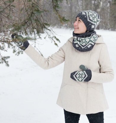 Needles: Cowl: Size 10 US / 6 mm circular needle, 16” / 60 cm long for ribbing. Size 11 US / 8 mm circular needle, 16” / 60 cm long. Hat: Size 10 US / 6 mm circular needle, 16” / 60 cm long for ribbing. Size 11 US / 8 mm circular needle, 16” / 60 cm long. Size 11 US / 8 mm in preferred style for small circumference knitting in the round. Mittens: Size 9 US / 5.5 mm in preferred style for small circumference knitting in the round for ribbing. Size 10 US / 6 mm in preferred style for small circumference knitting in the round.