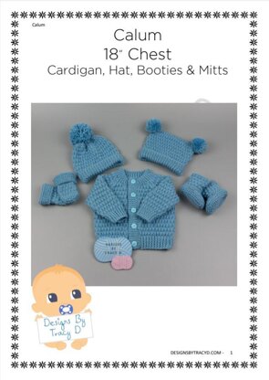 Calum is a Baby Knitting Pattern suitable for a boy or girl and has a cardigan, 2 styles of hat, square or bobble, mitts and booties. finished size is approx 18" chest made using DK yarn.