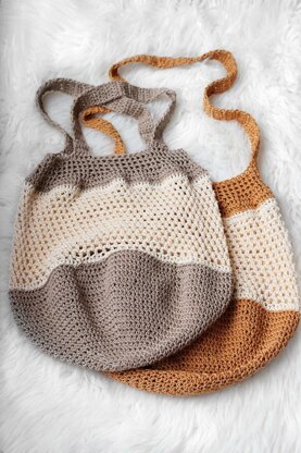 This market bag is created in the round by crocheting a spiral, then switching to joined rounds to hide the colour changes. The bottom of this bag was intentionally designed in a solid stitch to be able to carry your belongings without worrying about anything falling out. The mesh panel is in the center of the bag and crocheted in the round in a spiral to be completely seamless. There are no visible seams on this bag, and photo tutorials are included for the colour changes to make it as clear as possible. The straps are added at the end, and you are given 2 strap options: 2 shorter handles or 1 long strap.