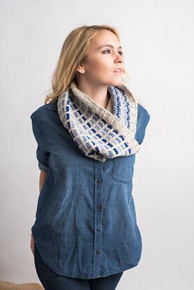Calypso Cowl is knitted in the round. The edge is worked in 2x2 Ribbing. The main body is worked in slipped stitch pattern, working with just one color of yarn each round.