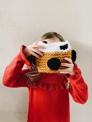 A soft camera knitted in the bulky yarn so it only takes a couple of hours to make. The body and the straps are knitted flat in garter stitch, lens and button are knitted in the round. Pieces will be sewed together at the end. I recommend measuring your kid for the perfect length strap! You need to know how to knit, purl, and basic increases.