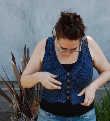 This is a pattern for a fitted waiscoat worked with or without a picot folded hem (yardage given for folded hem and cropped version). It is worked from the bottom up with a simple lace pattern that creates a nice curve to your peplum. Continue to work up the torso with some shaping and 4 st lace trim. Finally working straps and grating with the Kitchener st.