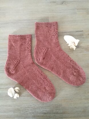 A pair of simple toe up socks but at the same time with a front worked with a combination of knit and purl stitches that keeps it interesting. On the front panel I tried to translate my vision of a fire on the beach or in the mountains during a camping into a knitted fabric.