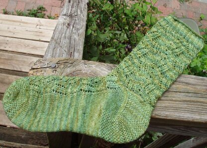 This is a lace sock that can be knit toe up or from the cuff down, with a slip stitch heel. There are 2 sizes, a 72 stitch leg and a 64 stitch leg. There is an option for doing the toe of the toe up sock in an eye of partridge stitch.