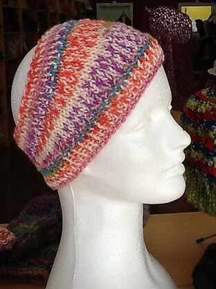 This earwarmer is quick to knit and can be embellished any way you want. It is worked flat and then seamed together in the back. Rows are knit across the long dimension, and short rows are added in the center to create extra width.