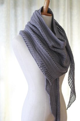 This is an asymmetrical triangular shawl knit from tip to end. The pattern alternatives between a slip-stitch and eyelet section, separated by stockinette stitch. The increases and decreases work together to create a bias in the fabric. The result is a lovely and elegant shawl that drapes beautifully. Knit this up in Woolfolk yarn to experience a shawl like no other.