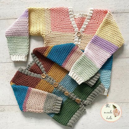 I have designed this cardigan with your yarn stash in mind. Since it is a bit more difficult at the moment to get yarn, you can use what you already have to create a beautiful kids cardigan in carousel colours!