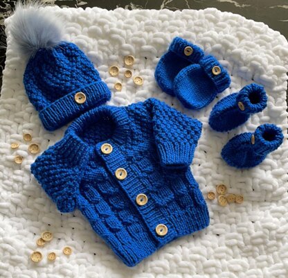 This pattern contains instructions for a Jacket and Traditional hat to fit 16″, 18″, 20″ and 22″ chest and the end product is larger as it is a jacket. By extending the length of the arms and body on the largest size, it would easily fit a 3/4 year old. I cannot stress enough to measure the child you are knitting for as all children are different.