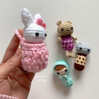 Be sure to get the free Mini Dolls patterns to fit these pouches! The mini dolls include: "Catnap Kitties", "Comfort Critters", "Bedtime Bunnies", and "Bedtime Babies". They are all free amigurumi crochet patterns on the Sweet Softies blog.