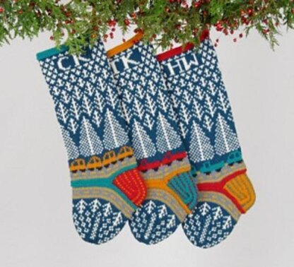 Pattern provides clear written instructions, along with color charts for each colorwya, to knit a Christmas stocking in the round. Stockings measure approximately 20" by 7", varying in size with individual designs.