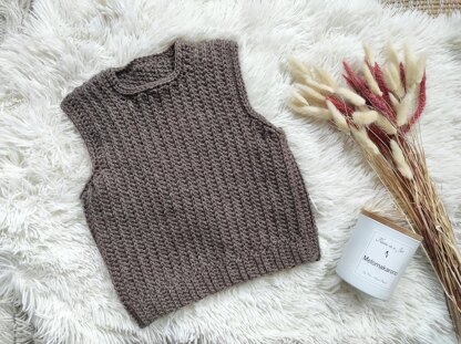 The Carson vest is a fitted crochet vest for boys and girls. It’s made with worsted weight yarn in a vertical construction. Made with simple crochet stitches that look knit, results in a ribbed effect.