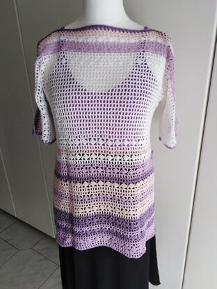 Un capo che può essere utilizzato sia come copricostume che come casacca sopra ad un top Lo sviluppo del capo è abbastanza semplice e adatto anche alle principianti Basteria seguire il punto dello schema e la lavorazione a punto filet Il modello è sviluppato in due pezzi identici per il davanti e il dietro Modello realizzato per una taglia M/L, nel pattern viene indicato come regolarsi per altre taglie Per una taglia M/L ho utilizzato circa 350 gr di filato