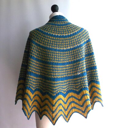 This top down shawl, uses a simple slip stitch pattern on the main body, to great effect. An i-cord is worked as you knit, which sits along the wingspan. Choose two colours and cast on!