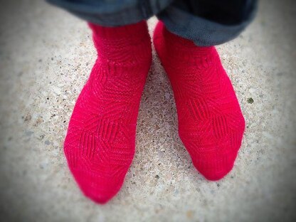 The squares of this pattern are all equal in size, but because of the nature of the different stitches used, some draw in, and some splay out, so the overall effect is one of undulating lines along the length of the sock.