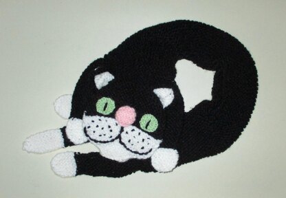 A cuddly cartoon cat to wrap around your neck – plenty long enough for an adult as well as a child, but can easily be made longer if you wish. Head has a loop for the tail so your cat can curl up. Here is a black and white cat – choose your own colours Knit flat in garter stitch (no purling), simple stitches and quick to make.