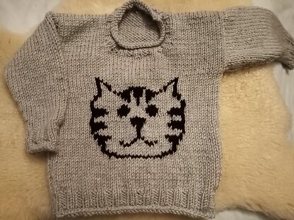 Digital knitting pattern for a cute cat sweater. Quick and easy to knit in chunky yarn, the design is simple with a standed motif on the front.