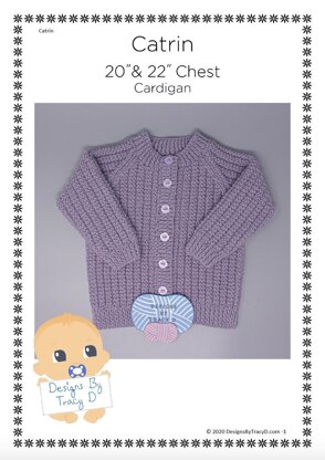 Catrin is a unisex Baby Knitting Pattern for a simple cardigan, with only 2 rows to the pattern. It is made using DK yarn with 3.25mm & 4mm needles and will fit a 20" and 22" chest (finished size) 150g of DK yarn required for each size. The 20" chest size will need 6 buttons, the 22" size will need 7 buttons