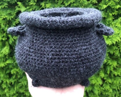 This pattern was designed using bulky-weight yarn (7 WPI) and a 5 mm (US H-8) hook. You can choose to use a different weight yarn and hook size, but it will alter the final size of the cauldron. When using the recommended yarn and hook size, the cauldron measures 16 cm wide and 11 cm tall.