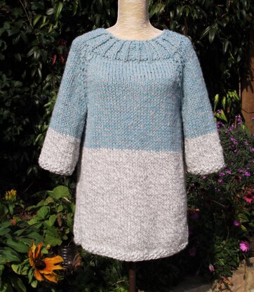 A gorgeous long line tunic sweater that's quick and simple to make. Worked mainly in stocking stitch with 3 rows of moss stitch on the lower edges and a wide ribbed yoke. This design does not require circular needles for the yoke, as it is designed in two sections, with a seam on each shoulder. Snuggly, big and warm but with a 2 tone twist!