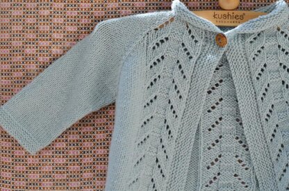 Cedar Lake features a top-down raglan construction, panels of totem pole lace, a mini shawl collar, and a single button closure at the neck. The body is knit flat, sleeves are worked in the round, and the button band and collar are picked up from the cardigan edges and knit last.