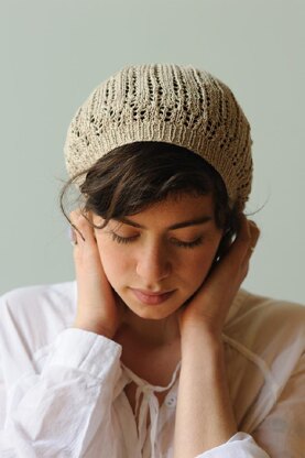 Celine is an easy spring/ summer beret which begins at the ribbed brim and is worked in the round in a simple lace pattern.