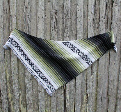 Knit from side to side in linen stitch and stranded stockinette. One side is fringed, the other is embellished with blanket stitch.