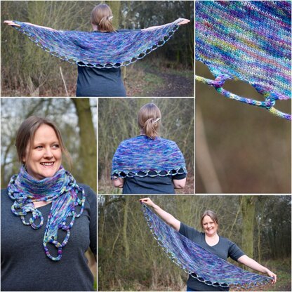 A fun and unique knit – the Chain Reaction shawlette is worked from a garter tab cast on and the crescent shape is made by increases at the end of each row. The body of the shawlette is knit in simple stockinette, and the fun part comes when you get to the border! Knit in strips and joined with a 3 needle bind off, the loops are constructed so that the whole piece is made in one go, with no sewing or loose ends to weave in at the end.