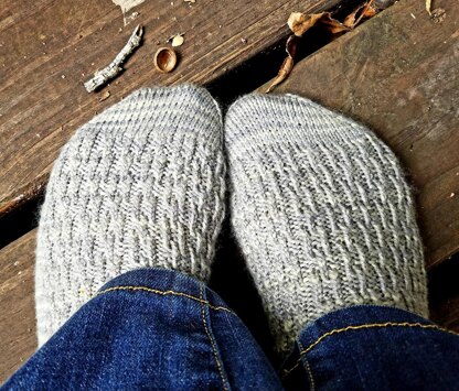 These socks are worked from the cuff down with a heel flap and gusset. The legs and instep feature a simple knit-purl pattern (note that the knits are all worked through the back loop) that forms a chainlink type pattern. The chainlink pattern is both charted and written out.