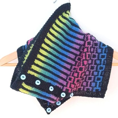 CHAINS & STRIPES Dive into this quick-to-knit cowl featuring a dramatically bold pattern created by using the mosaic knitting method. Mosaic knitting is an easy way to incorporate colorwork into your project. Cowl is worked flat, button band and buttons are worked last. Pattern contains written instructions.