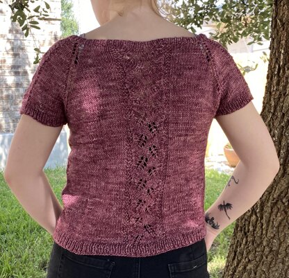 Yarn: Chaos Fiber Co. Tonal Elite Sock, (75% Superwash Merino/25% Nylon, 420 yards/100g), 2(2, 3, 3, 3, 4) skeins. 36” short-sleeved sample knit in Mauvelous, using approximately 680 yards.