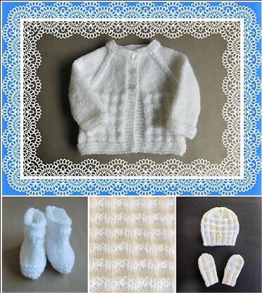 The set includes instructions for a cardigan jacket, hat, mittens, booties and a blanket