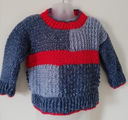 Charlie is designed for both boys and girls to fit age 1 - 6 years. This textured pullover is interesting and fun to crochet. Crocheted in dk yarn and three different colours to create an attractive sweater.