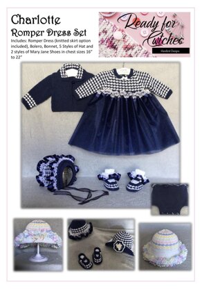 Pattern includes Romper Dress with options for a knitted skirt or an organza skirt attached with knitting in lace and options for long and short sleeves. It also includes a Bolero, Bonnet, 4 styles of Hat and 2 styles of Mary Jane shoes (one with knitted in socks).