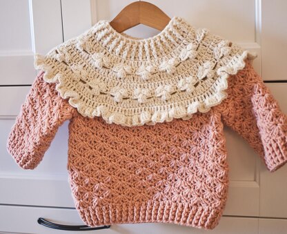 Charlotte Sweater is worked top down with a very textured yoke. It’s completely seamless. The ruffle is added later and can be also skipped. The sweater can be worked in one color too. It works up very quickly.